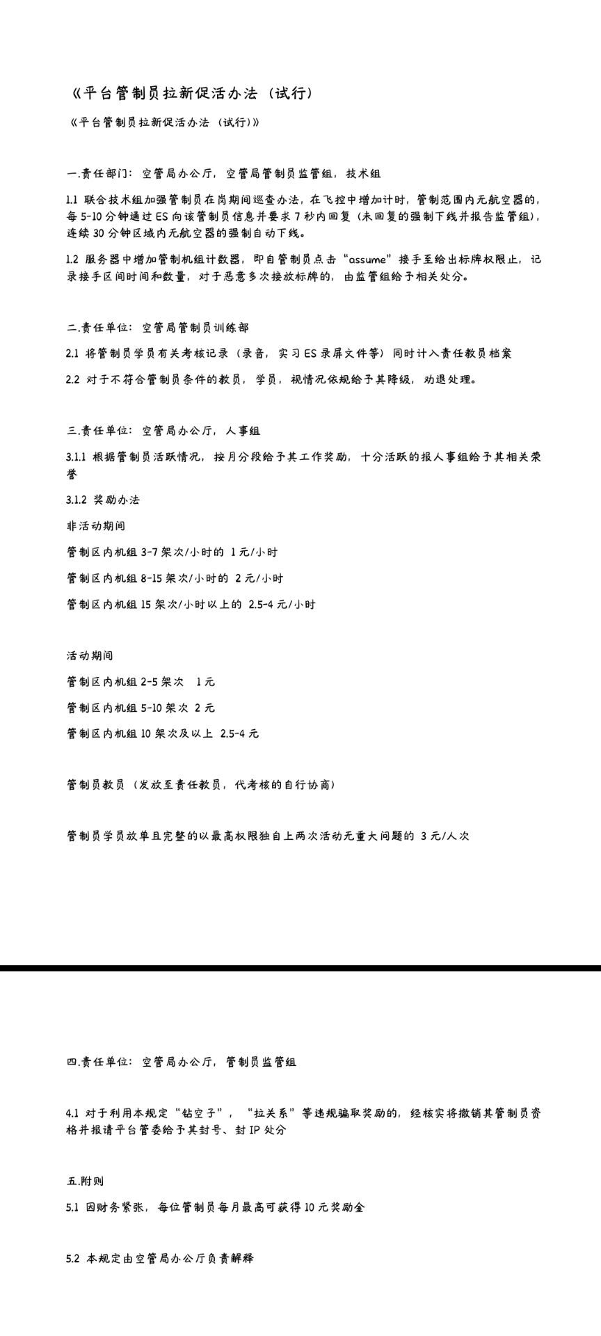 补充条款:拉入新管制员且其提出管制员申请30天内取得权限的,给予拉入者3元/人/次奖励,新管制员1.5元/人奖励(计入每人每月10元封顶线)